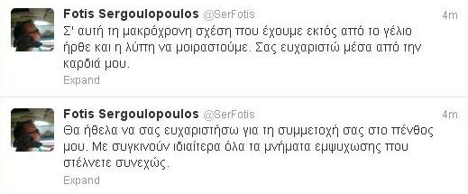 Μέσω Twitter θέλησε ο Φώτης Σεργουλόπουλος να πει το δικό του «ευχαριστώ» στους χιλιάδες φίλους και θαυμαστές του που τον κατέκλυσαν με μηνύματα συμπαράστασης και αγάπης από τη στιγμή που έγινε γνωστό ότι έφυγε από τη ζωή ο πολυαγαπημένος του πατέρας.