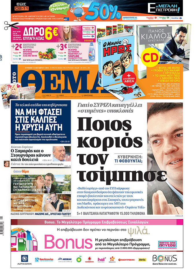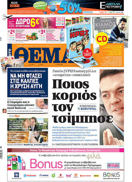 4. Το εν λόγω δημοσίευμα πιστοποιεί, επίσης, ότι, παρ’ όλες τις περιπέτειές τους, τόσο το Πρώτο Θέμα, όσο και ο Θέμος Αναστασιάδης εξακολουθούν να έχουν τις καλύτερες σχέσεις με το Μέγαρο Μαξίμου. Αναβαθμισμένες, μάλιστα, γιατί κάποτε παρέδιναν εκεί «υλικό», ενώ τώρα παραλαμβάνουν κιόλας.
