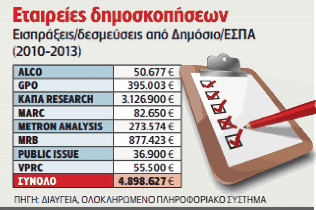 Έργα ύψους 5 εκατ. ευρώ έχουν αναλάβει από κρατικούς φορείς 8 εταιρείες δημοσκοπήσεων την τελευταία τετραετία. Στην ΚΑΠΑ RESEARCH η μερίδα του λέοντος, έπονται MRB και GPO.