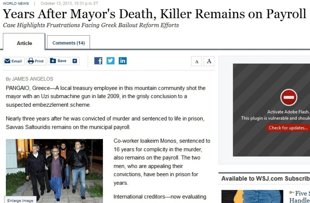 είναι ένα από τα βασικά θέματα στην ιστοσελίδα της Wall Street Journal που αναφέρει το παράδειγμα της δολοφονίας του δημάρχου Παγγαίου το 2009, το οποίο και χρησιμοποιεί ως ισχυρή ένδειξη ότι δεν είναι εφικτό να εκπληρώσει η χώρα μας τις δεσμεύσεις της για πραγματική μεταρρύθμιση του δημοσίου και να απομακρύνει τους υπαλλήλους που κρίνονται ακατάλληλοι.