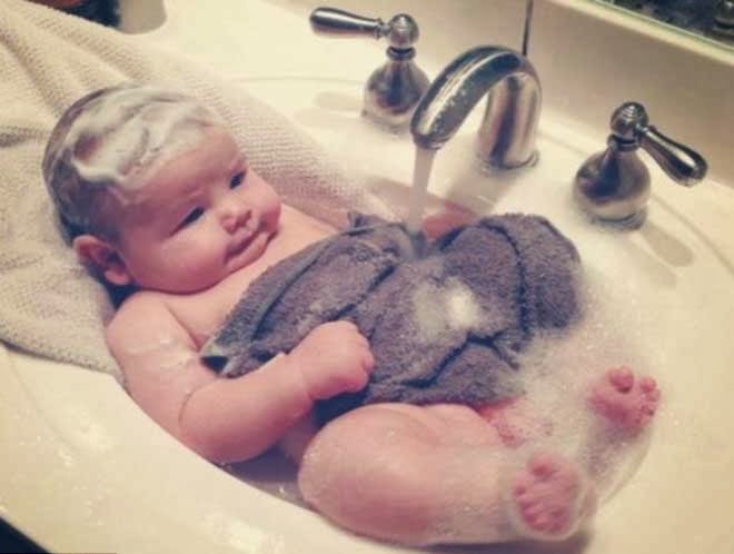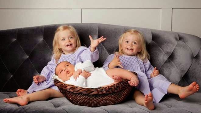 Ο μπέμπης φοράει ήδη ίδιο νούμερο ρούχων με τις δίχρονες αδελφές του και ποζάρει στις φωτογραφίες όλο χάρη.