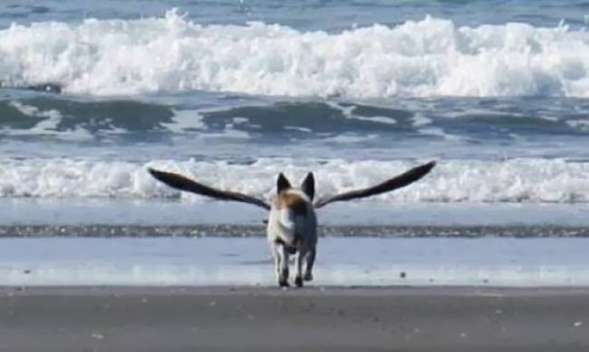 Η 22χρονη φωτογράφος έβγαζε φωτογραφίες τον σκύλο της φίλης της στην παραλία. Όταν τις κοίταξε καλύτερα είδε πώς μπροστά από τον σκύλο ήταν ένας μεγάλος γλάρος, ο οποίος ακριβώς την ώρα του «κλικ» άνοιξε τα φτερά του δημιουργώντας αυτό το αποτέλεσμα.