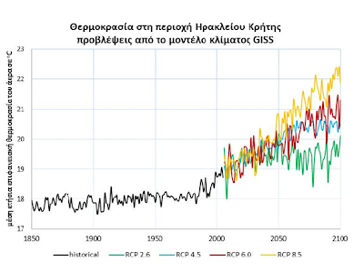Η παρακάτω εικόνα δείχνει τη μεταβολή της μέσης ετήσιας θερμοκρασίας στην ευρύτερη περιοχή του Ηρακλείου Κρήτης από το 1850 μέχρι το 2100. Για ευκρίνεια στην εικόνα δε συμπεριλαμβάνονται οι υπολογισμοί τυπικών αποκλίσεων από αυτές τις τιμές.