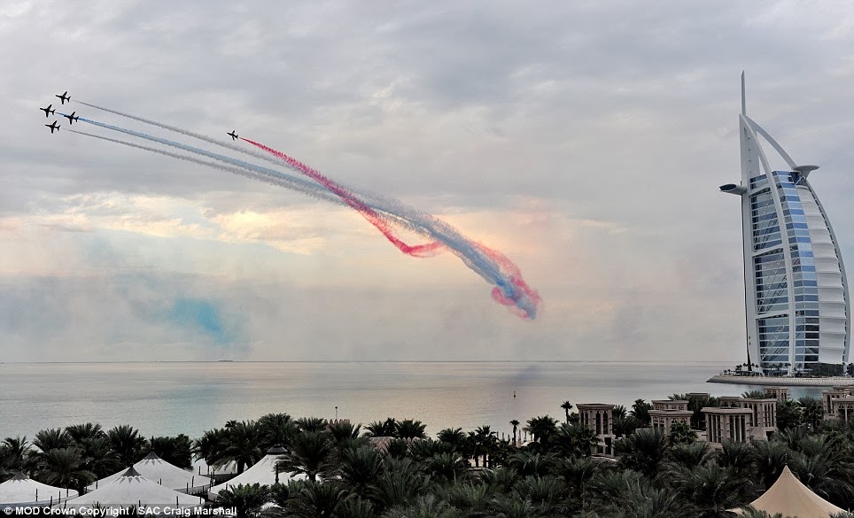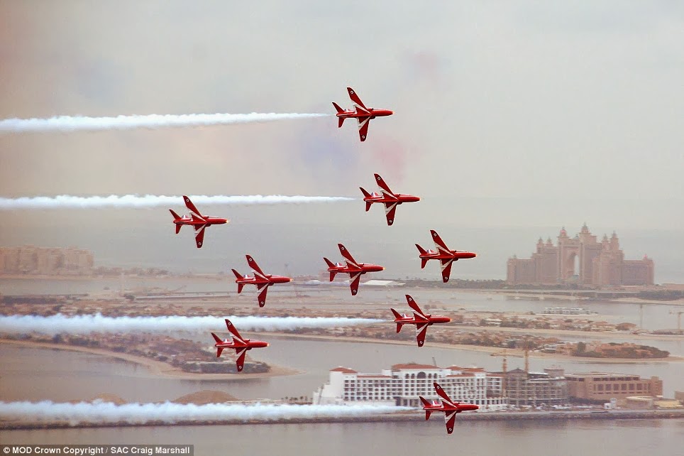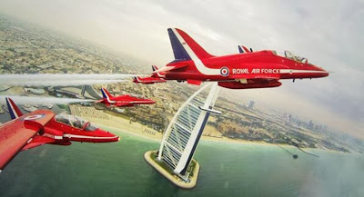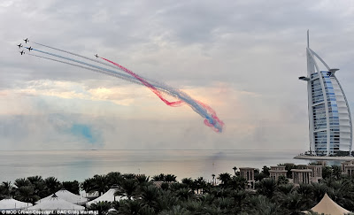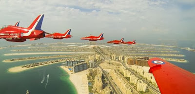 Η Βασιλική Πολεμική Αεροπορία Red Arrows ζωγράφισε τον ουρανό του Ντουμπάι με τα σύμβολά της το κόκκινο, το λευκό και το μπλε...σε μία εντυπωσιακή επίδειξη κατά τη διάρκεια της μεγάλης περιοδεία τους στη Μέση Ανατολή.