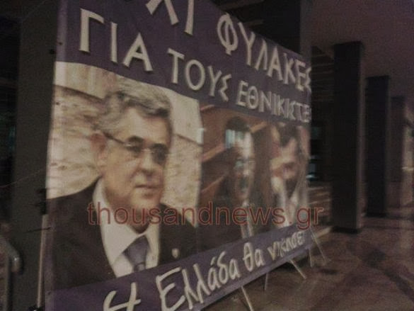 Αποκλεισμένη από κλούβες των ματ η οδός 26ης Οκτωβρίου, μπροστά από το δικαστικό Μέγαρο όπου είχαν στήσει μικροφωνική εγκατάσταση και μπάνερ με τα προφυλακισμένα μέλη του κόμματος.