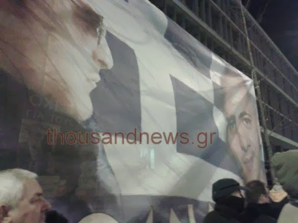 Τα άτομα πέταξαν και φυλλάδια στο δρόμο με συνθήματα "Κάτω η χούντα του μνημονίου" και "Οι κλέφτες να πάνε φυλακή".