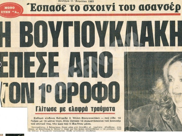 Ήταν Δευτέρα 11 Απριλίου του 1983 όταν μεγάλη απογευματινή εφημερίδα κυκλοφόρησε στα περίπτερα με πρωτοσέλιδο την λαμπερή πρωταγωνίστρια και με τίτλο : «Η Βουγιουκλάκη έπεσε από τον πρώτο όροφο»