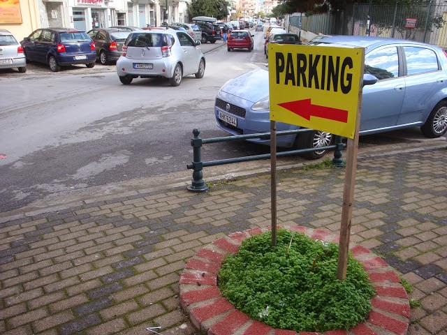 Στη θέση ενός δέντρου λοιπόν ή κάποιου άλλου φυτού που θα μπορούσε να δεσπόζει εντός του παρτεριού έχει τοποθετηθεί μια ξύλινη πινακίδα στην κορυφή της οποίας αντικρίζει κανείς τη λέξη… parking!