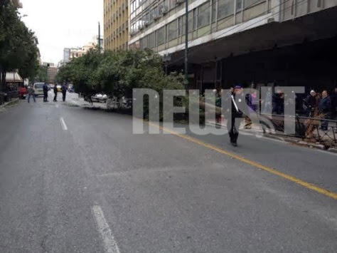 Δέντρο 30 μέτρων έξω από το υπουργείο Εργασίας ξεριζώθηκε από τους θυελλώδεις ανέμους που σαρώνουν τις τελευταίες ώρες την Αττική και "ξαπλώθηκε" στη λεωφόρο Σταδίου.