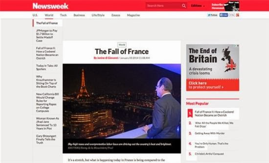 Το άρθρο του Newsweek, το οποίο έγραψε μια αμερικανή δημοσιογράφος που ζει στο Παρίσι, η Τζανίν ντι Τζιοβάνι, και δημοσιεύθηκε στις 3 Ιανουαρίου, έχει προκαλέσει πολλές επικρίσεις στο διαδίκτυο. Μεταξύ άλλων, η ντι Τζιοβάνι αναφέρει στο άρθρο της ότι μετά την ανάληψη της προεδρίας από τον Φρανσουά Ολάντ το 2012 «η ανώτατη φορολογική κλίμακα είναι το 75%», ενώ παράλληλα έχουν αυξηθεί κατακόρυφα οι φόροι εισοδήματος και οι εργοδοτικές εισφορές, γεγονός που έχει ωθήσει τους Γάλλους να μεταναστεύσουν μαζικά από τη χώρα.
