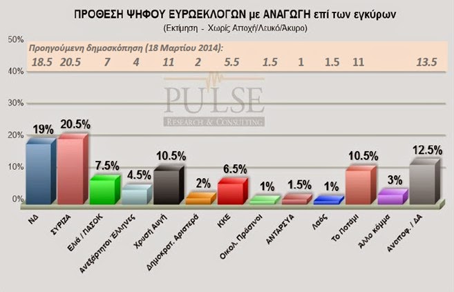 Στην έρευνα που θα προβληθεί στην εκπομπή “Ανασκόπηση Σήμερα” με τον Βασίλη Ταλαμάγκα την Πέμπτη στις 21.00 στην πρόθεση ψήφου ευρωεκλογών με αναγωγή ο ΣΥΡΙΖΑ παίρνει την πρώτη θέση με ποσοστό 20,5% έναντι 19% που κατέχει η Νέα Δημοκρατία. Στη τρίτη θέση βρίσκονται “Το Ποτάμι” και η Χρυσή Αυγή με ποσοστό 10,5% και τέταρτο κόμμα η “Ελιά” με 7,5%. Ακολουθούν ΚΚΕ 6,5% Ανεξάρτητοι Έλληνες 4,5%, ΔΗΜΑΡ 2%, ΑΝΤΑΡΣΥΑ 1,5%, Οικολόγοι Πράσινοι 1%, ΛΑΟΣ 1%, Άλλο Κόμμα 3%, 12,5% Αναποφάσιστοι.
