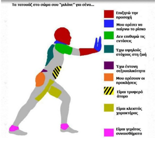 Οπως φαίνεται και από την παρακάτω εικόνα, όσοι κάνουν τατουάζ στο κεφάλι ή στον πήχυ επιζητούν την προσοχή, όσοι κάνουν σε λαιμό, αυχένα και χέρια τους αρέσει να παίρνουν ρίσκο, χαμηλά στη μέση ότι «έχουν έντονη σεξουαλικότητα», στα μπράτσα ότι δεν επιθυμούν εντάσεις, στην πλάτη ότι έχουν υψηλούς στόχους στη ζωή, στους γλουτούς ότι τους αρέσουν οι προκλήσεις, στην κοιλιά ότι είναι τρυφεροί, στο εσωτερικό των μηρών ότι είναι κλειστοί χαρακτήρες και στους αστραγάλους ότι είναι γεμάτοι συναισθήματα.