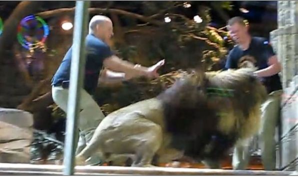 Μετά κόπων προσπάθησε ο άλλος εκπαιδευτής να το ηρεμήσει και να μπει στη μέση, αλλά το λιοντάρι κυνηγούσε μανιωδώς το στόχο του! ("Μη σου τύχει τέτοιο πράγμα!")