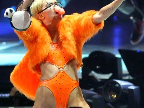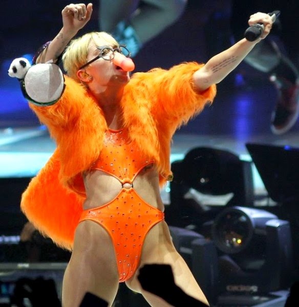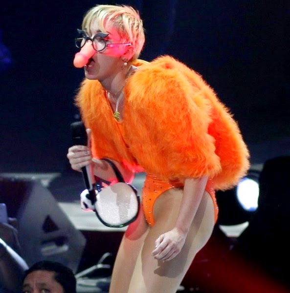 Μετά τα πρόσθετα οπίσθια, η 21χρονη τραγουδίστρια εμφανίστηκε επί σκηνής στο Μεξικό με ένα πλαστικό ομοίωμα πέους στη θέση της μύτης της και έδειχνε να το απολαμβάνει. Την τραγική της εμφάνιση συμπλήρωσε ένα φωσφοριζέ πορτοκαλί γούνινο σακάκι που έκανε την Σάιρους να μοιάζει με μεθυσμένο στο Halloween.