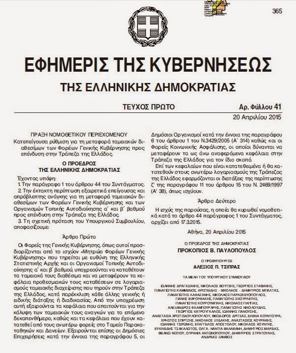 «Οι Φορεις της Γενικής Κυβέρνησης και οι Οργανισμοί Τοπικής Αυτοδιοίκησης α΄ και β' βαθμού, υποχρεούται να καταθέτουν τα ταμεικά τους διαθέσιμα και να μεταφέρουν τα κεφάλαια προθεσμιακών καταθέσεων σε λογαρισμούς διαχείρησης που τηρούν στην Τράπεα της Ελλάδος, κατά παρέκκλιση κάθε άλλης γενικής ή ειδικής διάταξης και διαδικασίας. Από αυτή την υποχρέωση εξαιρούνται τα κεφάλαια που απαιτούνται για την κάλυψη των ταμειακών αναγκών για το επόμενο δεκαπενθήμερο καθώς κι τα κεφάλαια που έχουν κατατεθεί στο Ταμείο Παρακαθηκών και Δανείων. Επίσης, εξαιρούνται οι Δημόσιες Επιχιερήσεις και οι Ογανισμοί».