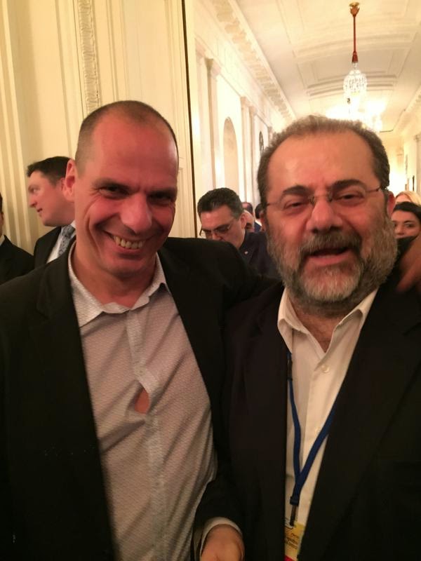 Στη φωτογραφία εμφανίζεται ο δημοσιογράφος και ο έλληνας υπουργός Οικονομικών σε στιγμιότυπο από τη Ουάσινγκτον, όπου βρέθηκε ο Γιάννης Βαρουφάκης.