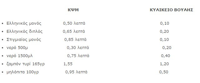 Ενδεικτικές τιμές του Κυλικείο της Βουλής και των ΚΨΜ απανταχού της Ελλάδος!