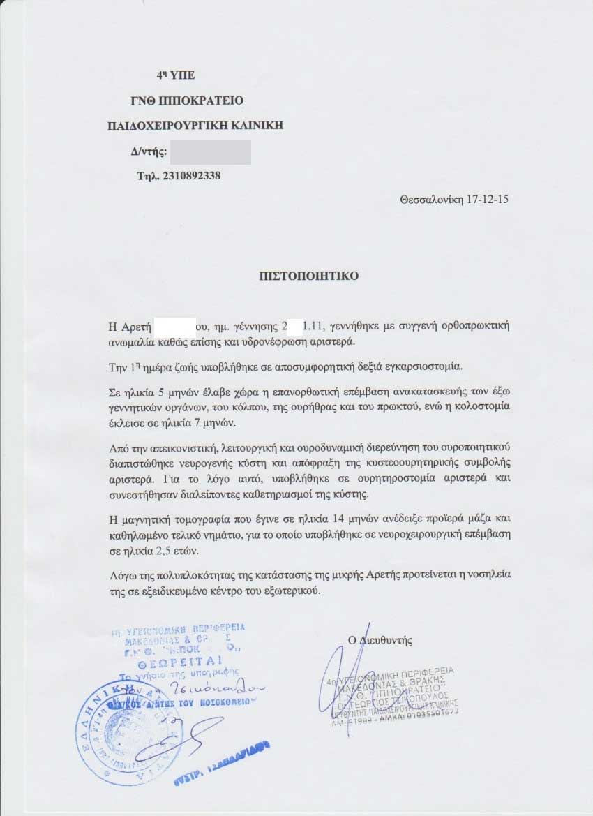Μέχρι σήμερα έχει υποβληθεί σε αρκετές επεμβάσεις στο Ιπποκράτειο Θεσσ/νικης και στο Παίδων Αγ.Σοφιας Αθηνών.